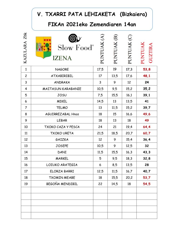 El pasado domingo 14 de noviembre, tuvo lugar en Gamiz Fina el V Concurso de Txarri Patak en salsa vizcaína. V. TXARRI PATA LEHIAKETA (Bizkaiera). Al certamen se presentaron 19 cazuelas