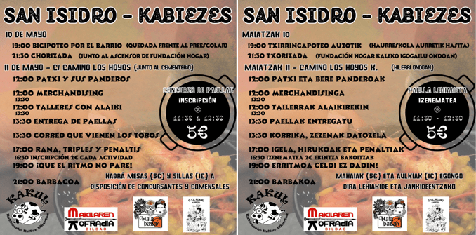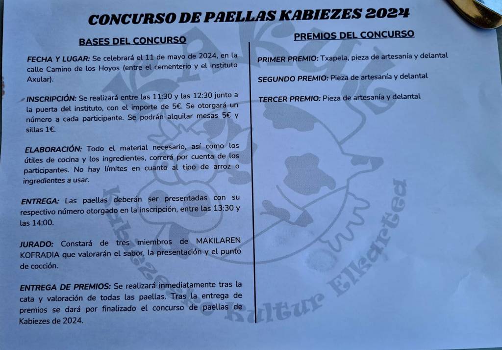 El pasado día 11 tuvo lugar en Kabiezes y dentro de las fiestas de San Isidro, una nueva edición, la sexta, de su concurso de paellas a la que MAKILAREN KOFRADIA acudió como Jurado.